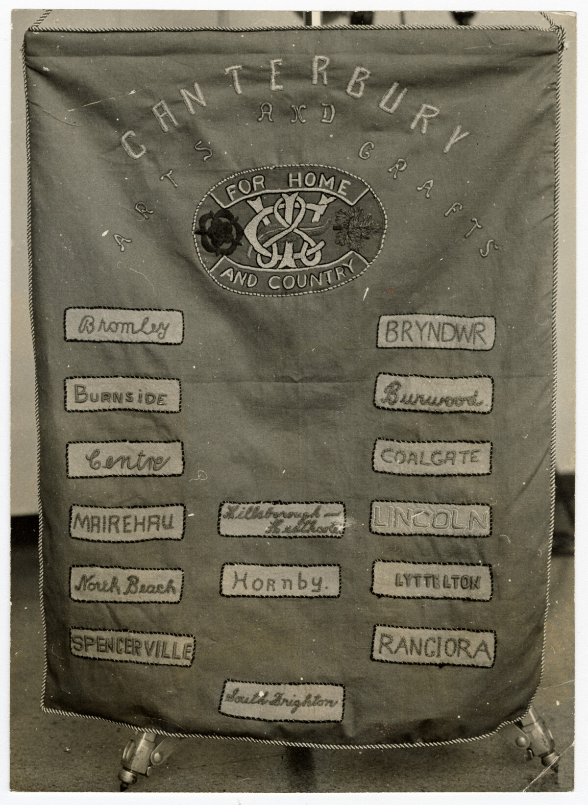 The new banner for the arts and crafts circles of the Canterbury Women's Institute, showing the names of districts.