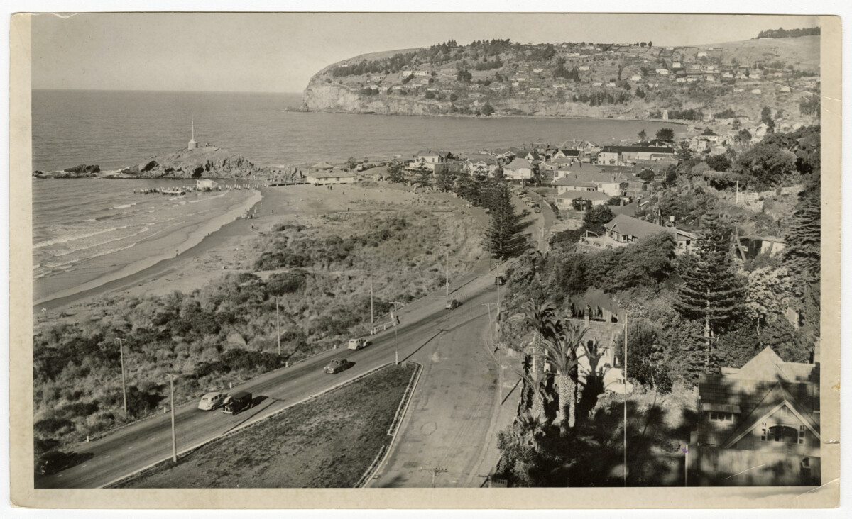 View from Clifton showing Sumner beach, Cave Rock, houses in Sumner, Scarborough, and Whitewash Head.