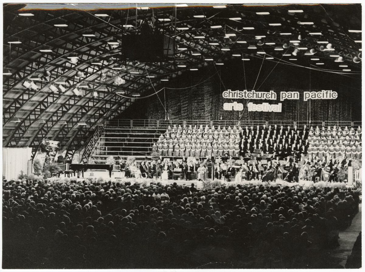 View from the rear of the audience and stage with orchestra and choir at the King Edward Barracks during the Christchurch Pan Pacific Arts festival.