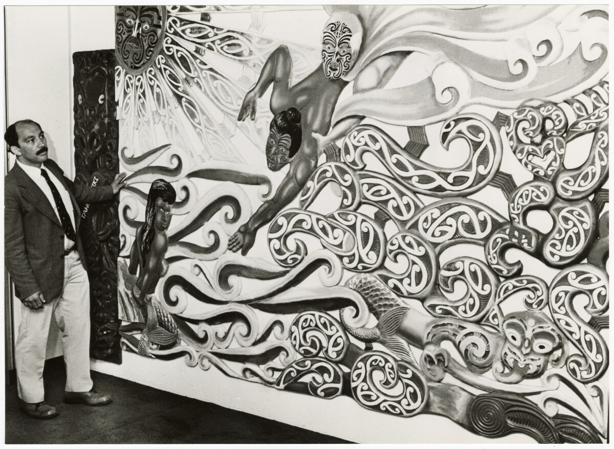 Mr Steve Paewai of the Māori Affairs Department stood next to a mural representing the ancestral heritage of the Ngāi Tahu and Kāti Mamoe tribes of the South Island at the Māori Land Court and offices in Peterborough Street.