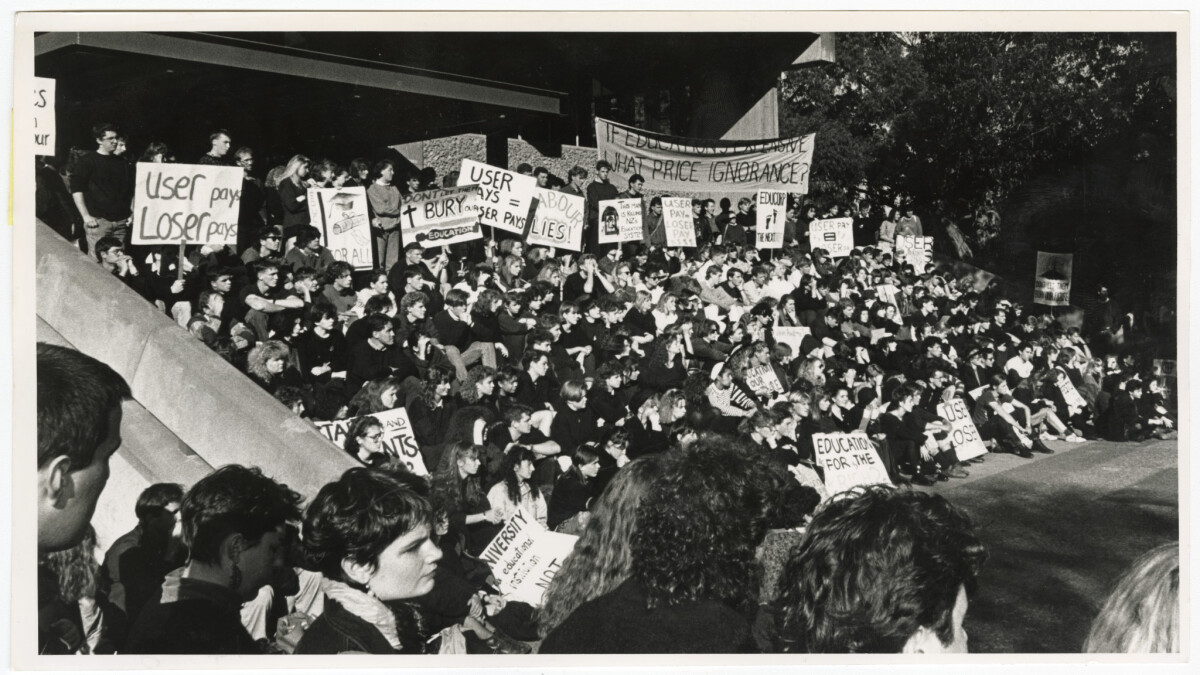 Students on the steps of James Hight Library at the University of Canterbury protesting the increase of student fees by Labour.
