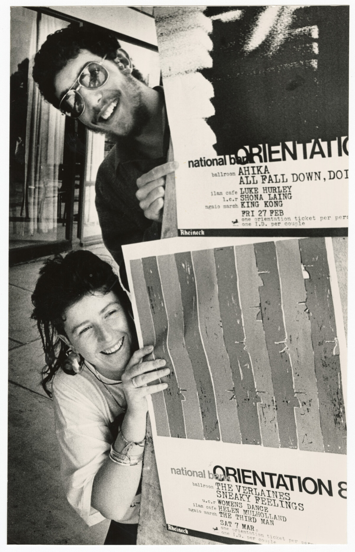 Orientation '87 organisers Evan Millner and Linda Beatson with some of the posters at the University of Canterbury.