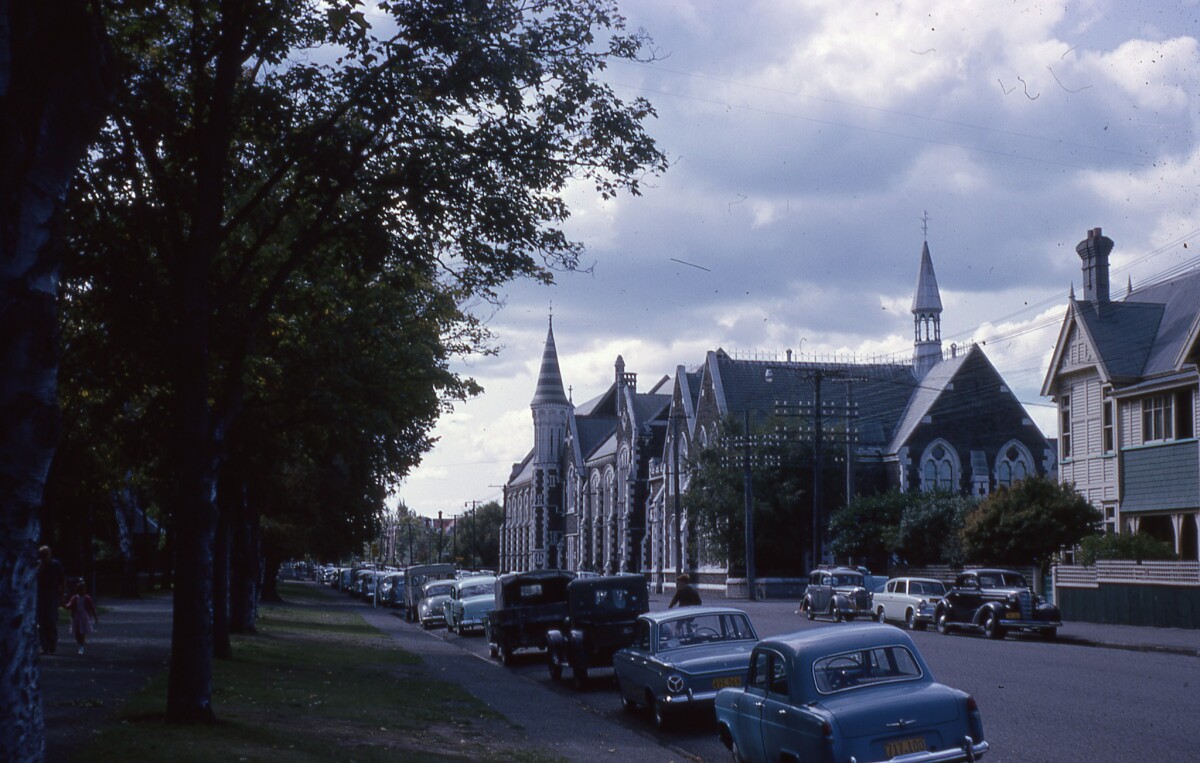 Street scene of Rolleston Avenue looking north towards the University of Canterbury buildings. Cars are parked along the road in the foreground.