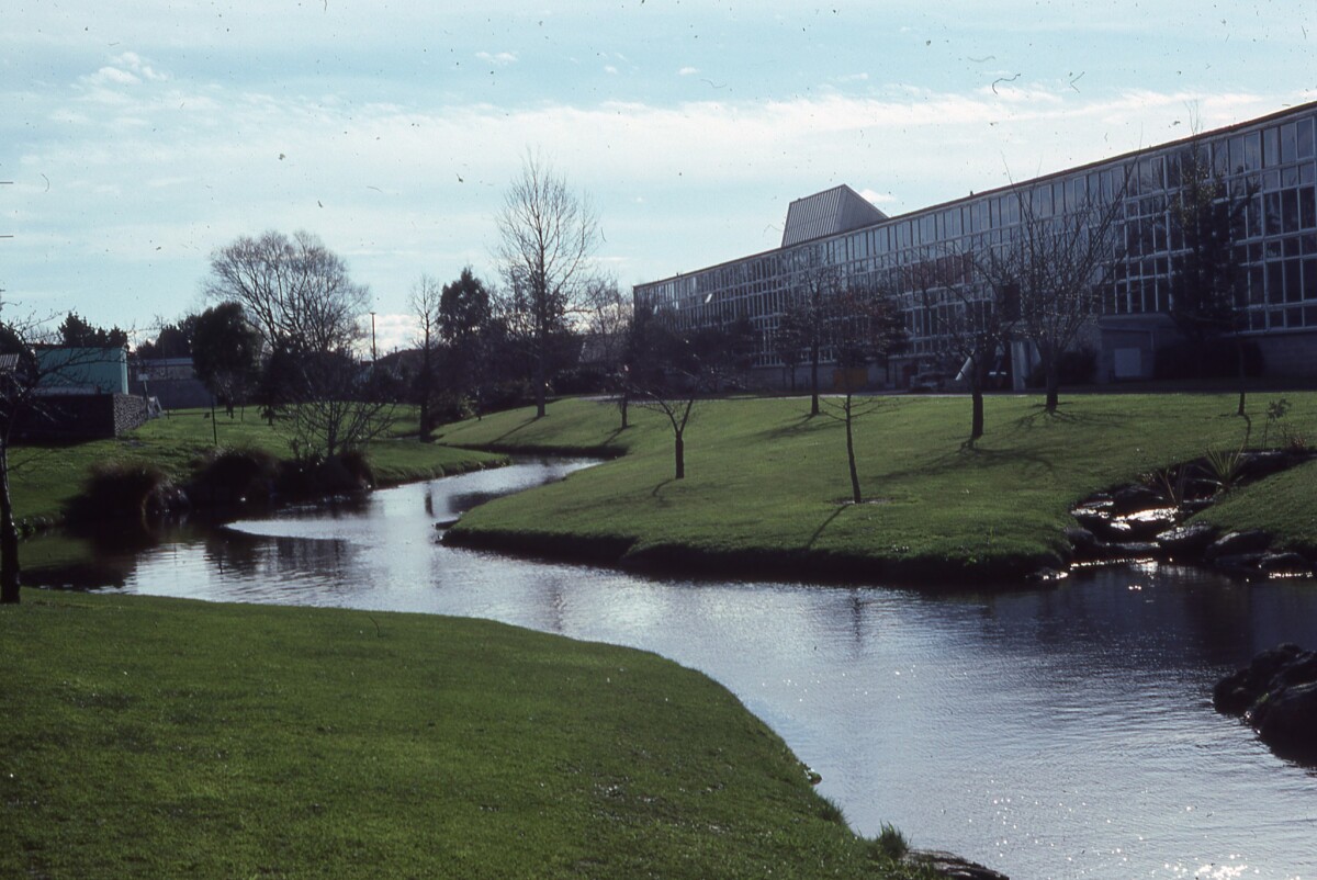 View of Okeover Stream and the School of Engineering building at the University of Canterbury Ilam campus.
