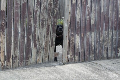 Close-up of a dog peeking out from the gate at 412 Marine ...