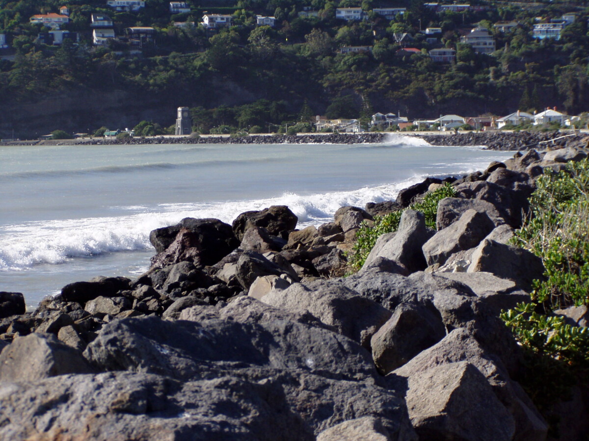 Sumner Beach at high tide. The Esplanade runs on the right hand side with the Sumner Scarborough Clock Tower in the background.