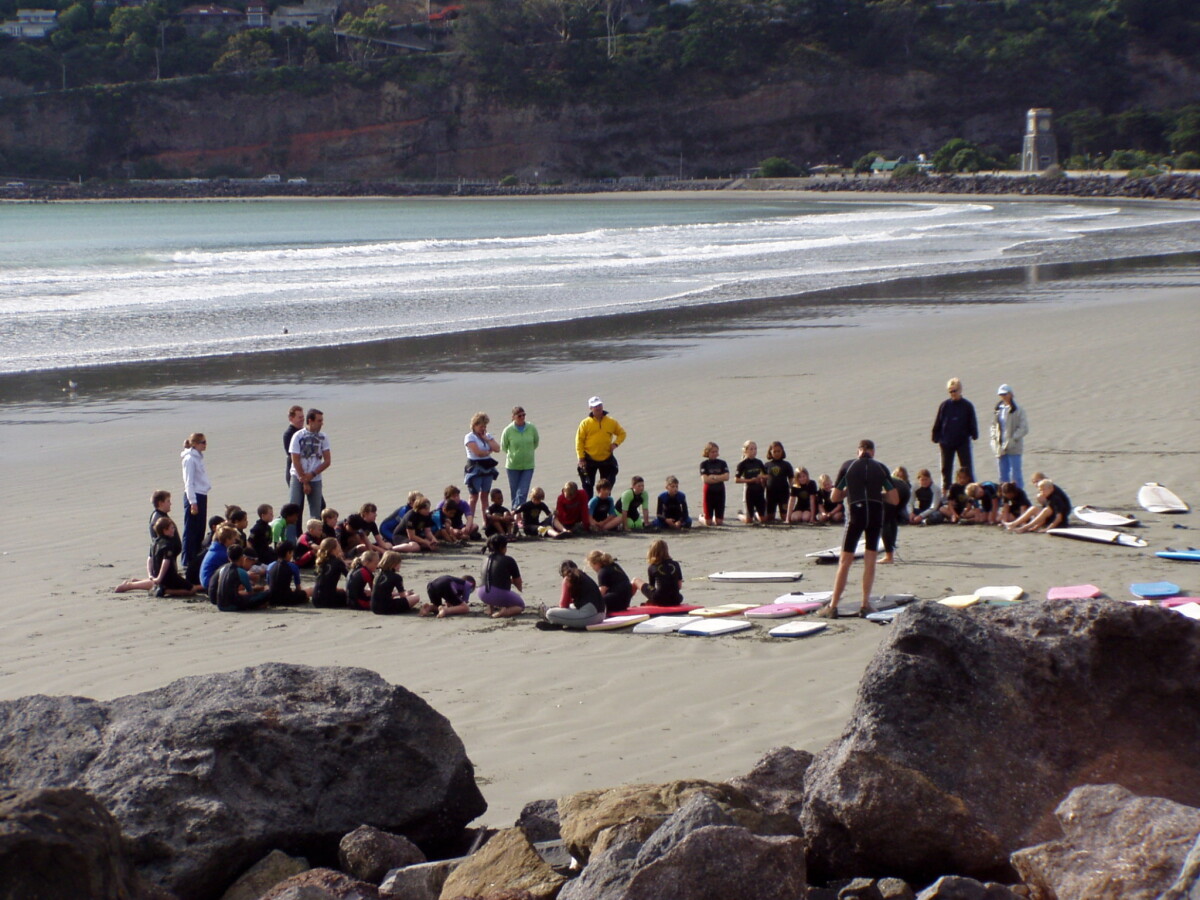 Group of children on Sumner Beach taking part in a surf lesson prior to entering the water. The Esplanade and the Scarborough Sumner Clock Tower are visible in the background.