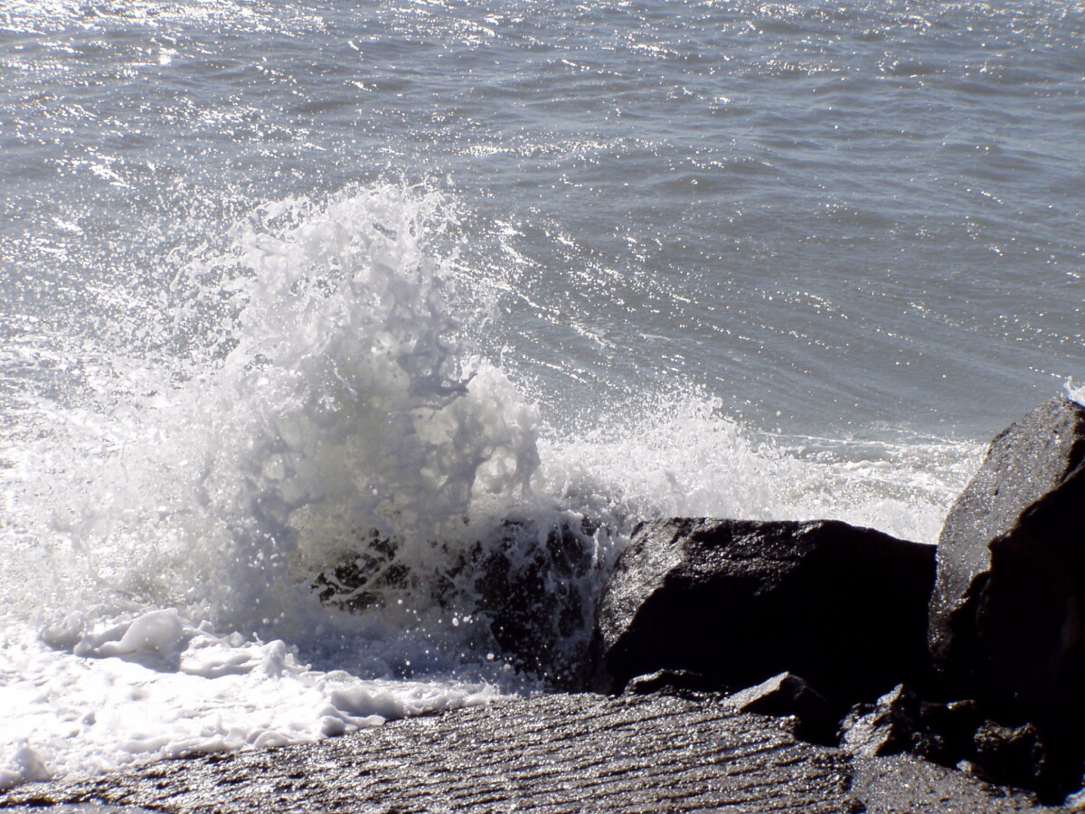 View of a wave splashing over rocks at Sumner Beach.