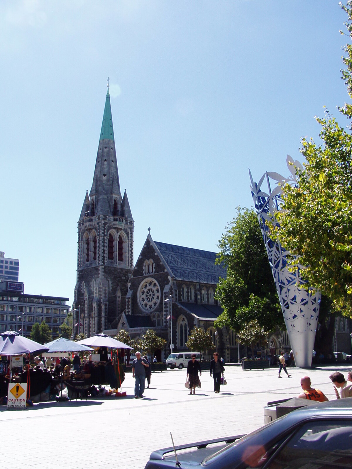 ChristChurch Cathedral from across Cathedral Square. The Chalice sculpture is visible on the right with an outdoor market on the left.