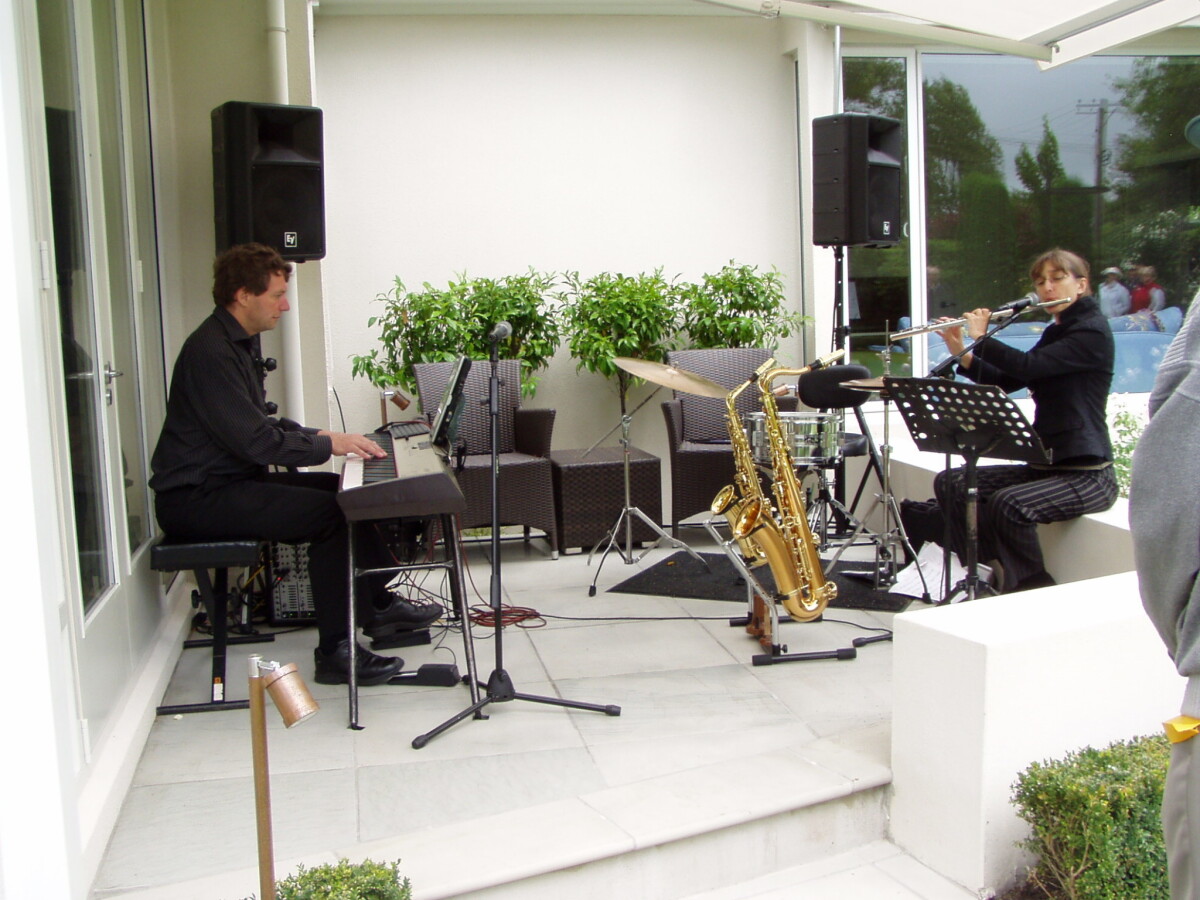 A keyboard player and a flautist performing at a residential garden. Two Saxophones are also visible next to the players.