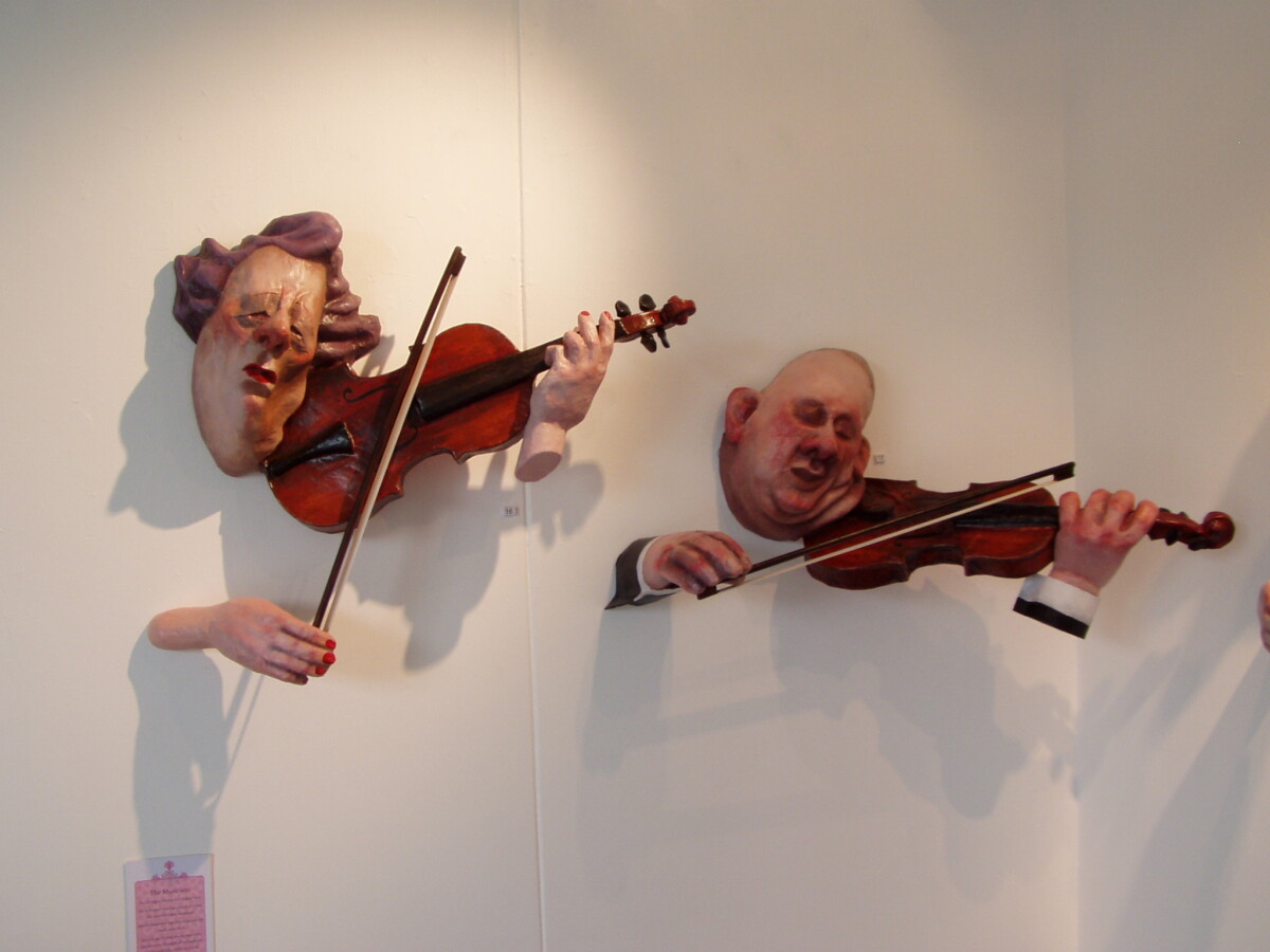 Close-up of two wall-mounted sculptures of caricature style head and hands playing violins on display at Little River Gallery, Little River on Banks Peninsula.