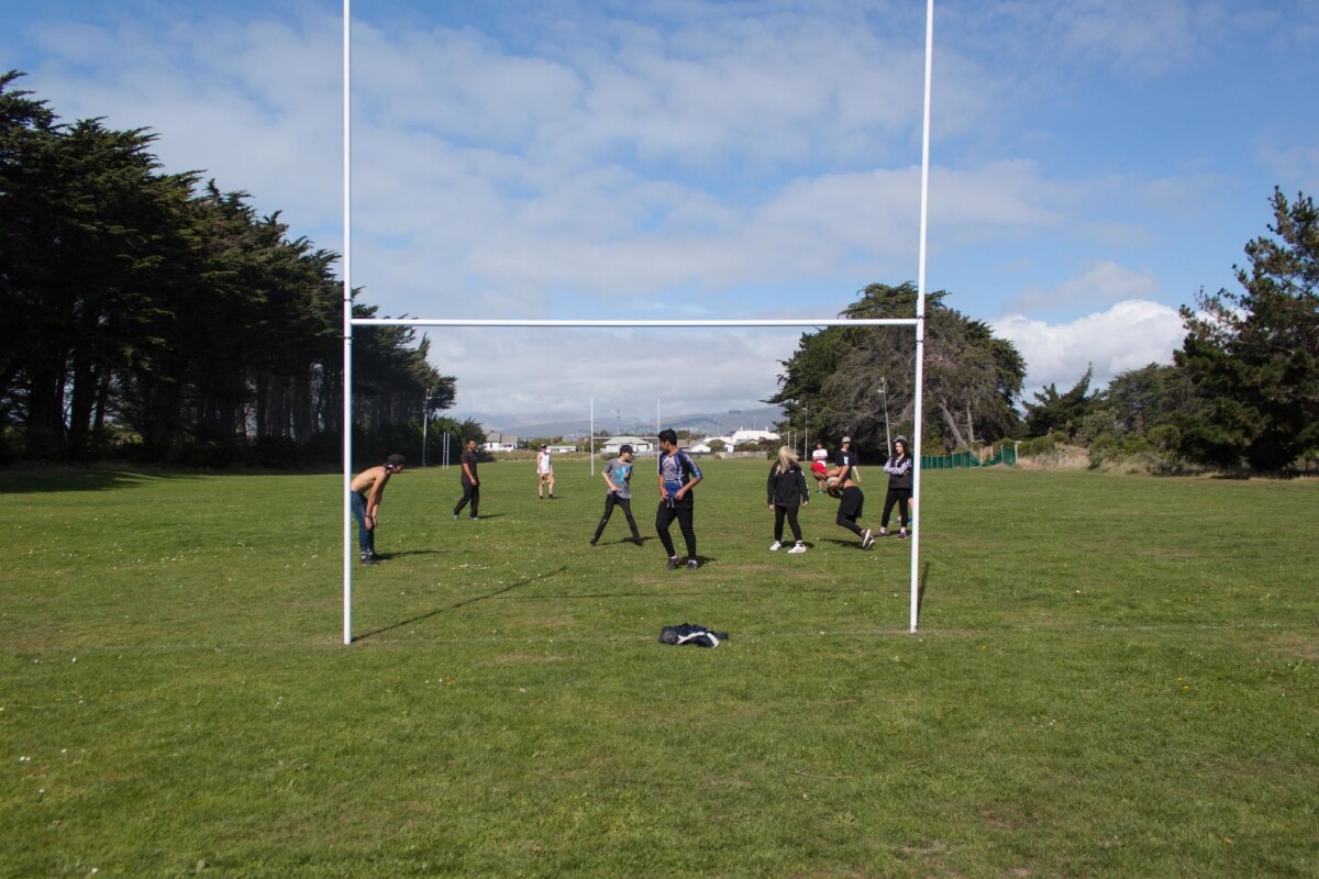 Students from Te Ora Hau playing touch rugby at Thompson Park, New Brighton with the Port Hills in the background. Te Ora Hau is an alternative education school. The students come to Brighton to surf and take part in physical activities.