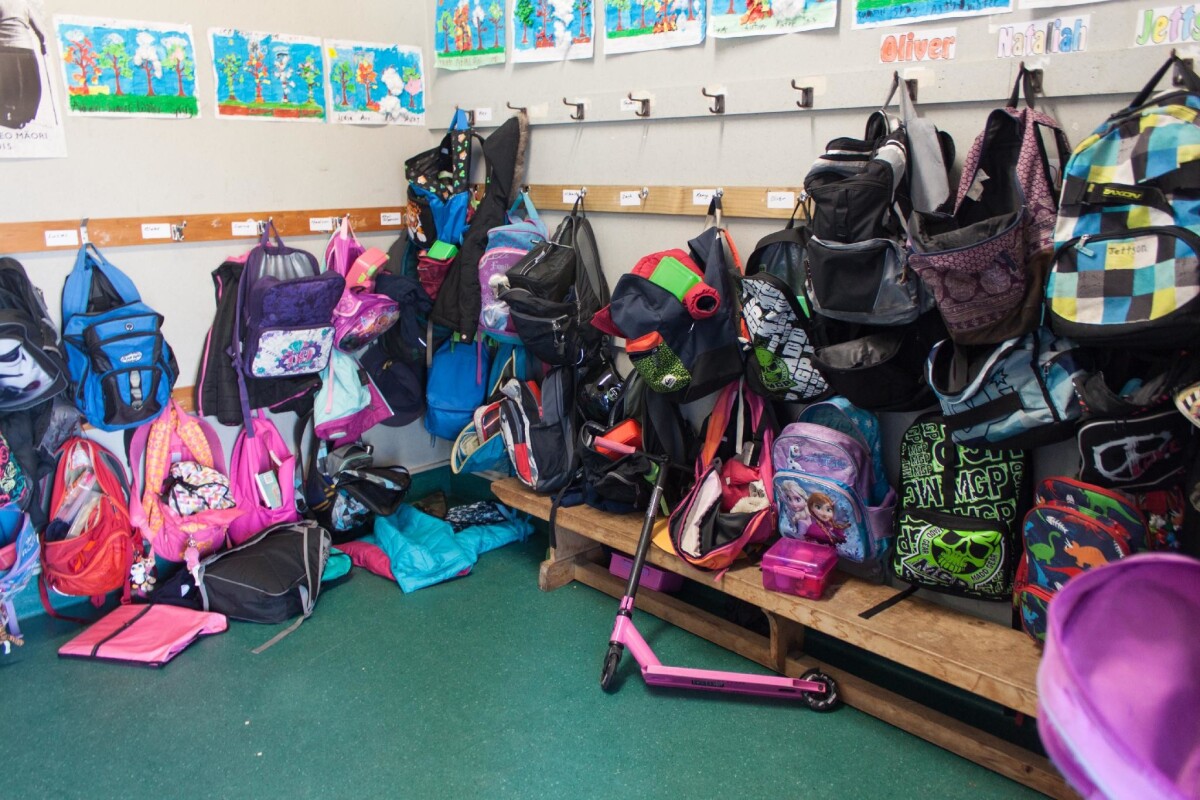 Close-up of students bags hanging in a cloakroom at South New Brighton School. The photographer was told to take a photo of the cloakroom, as they are becoming a thing of the past - funding does not cover a separate room for bags, and many schools are now having to find alternate places for their bags.