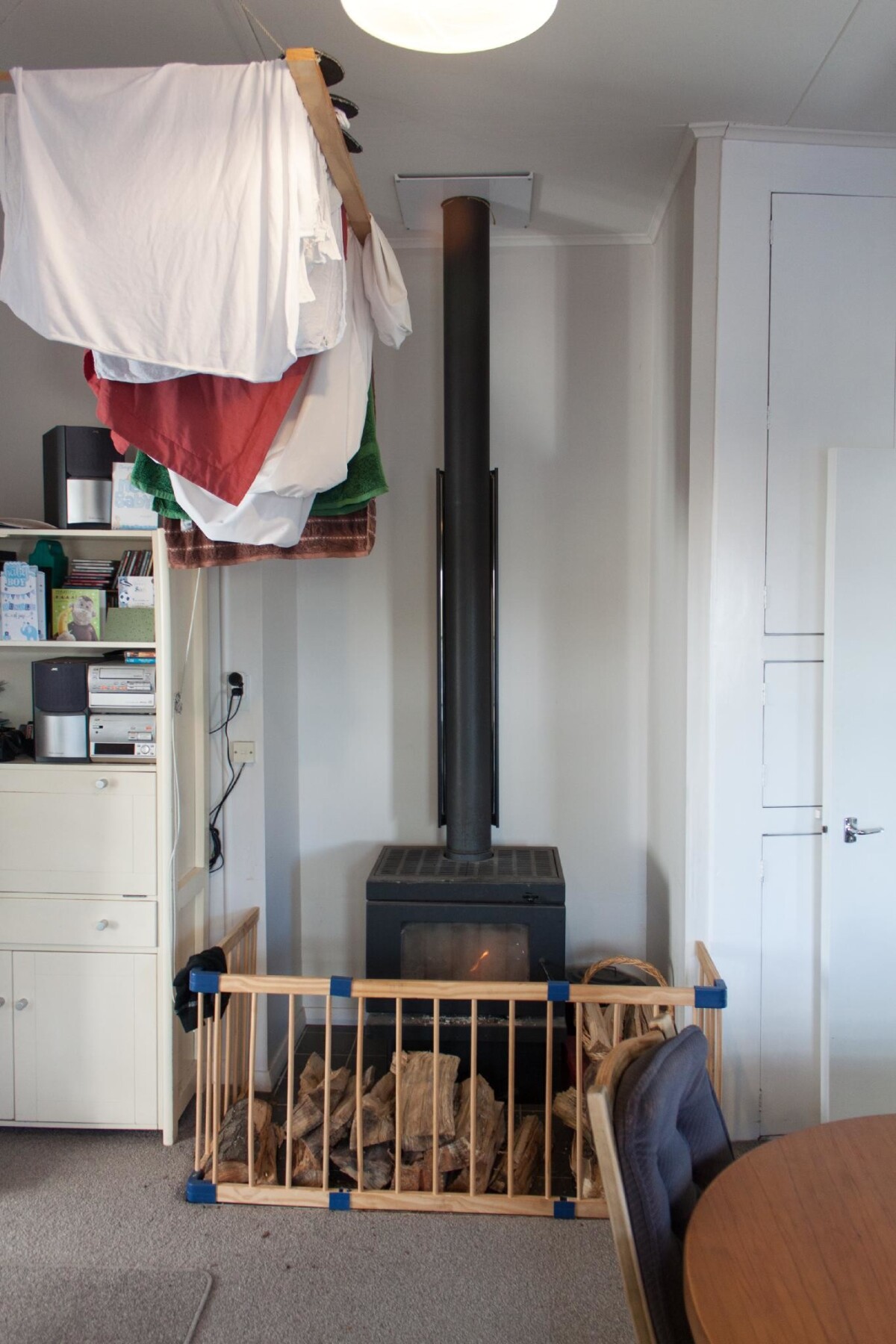 Interior of a lounge with a log burner in Shanna's house on Marine Parade, New Brighton,