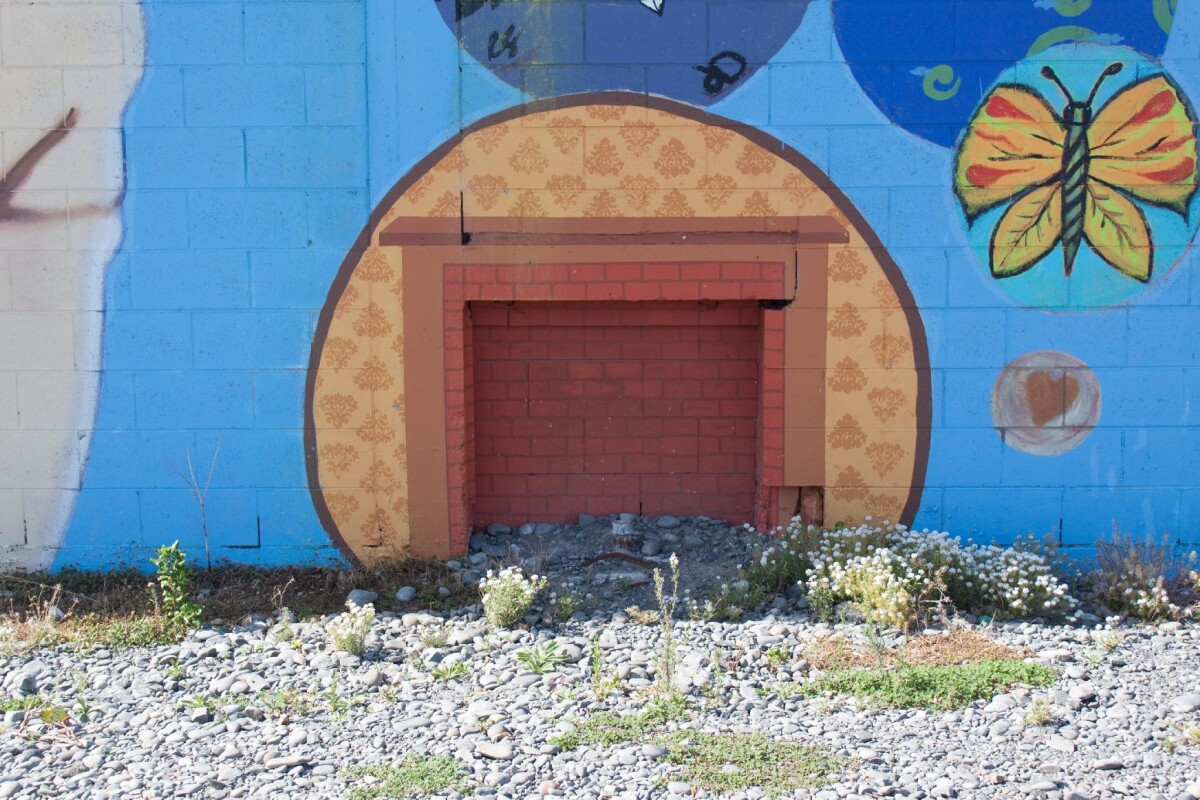 Close-up of a fireplace shape painted on the side of a building as street art in New Brighton Mall, New Brighton.