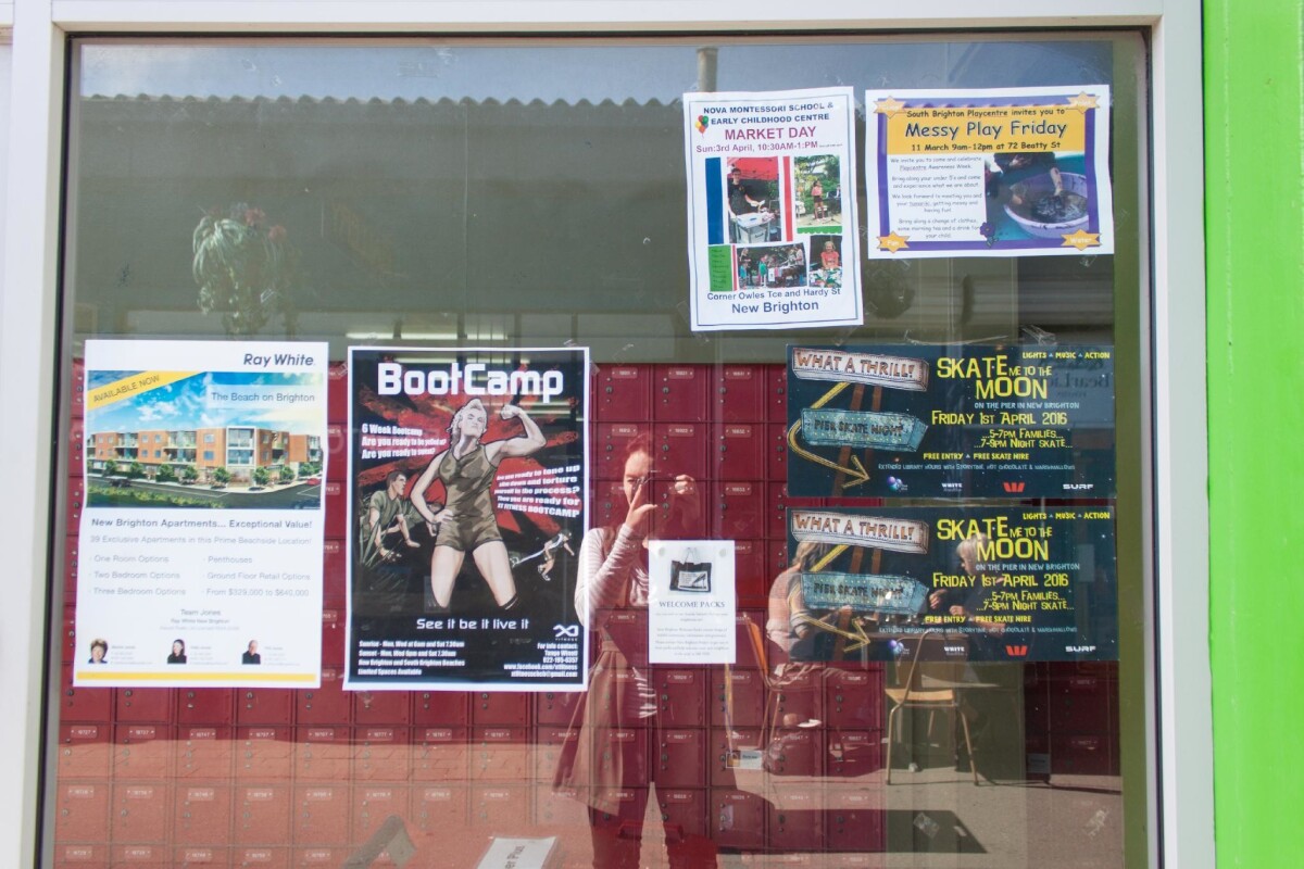 Advertising posters outside the PO Box office on Carnaby Lane, New Brighton Mall.