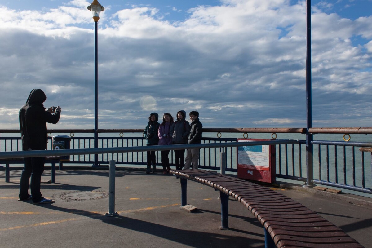 Tourists posing for a photograph at the end of New Brighton Pier.