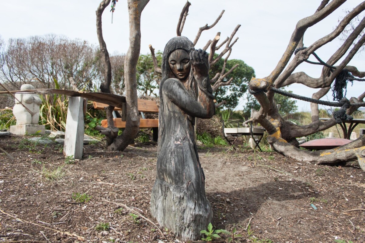 A wooden sculpture of a woman in the South New Brighton Sculpture Garden on Marine Parade, South New Brighton.