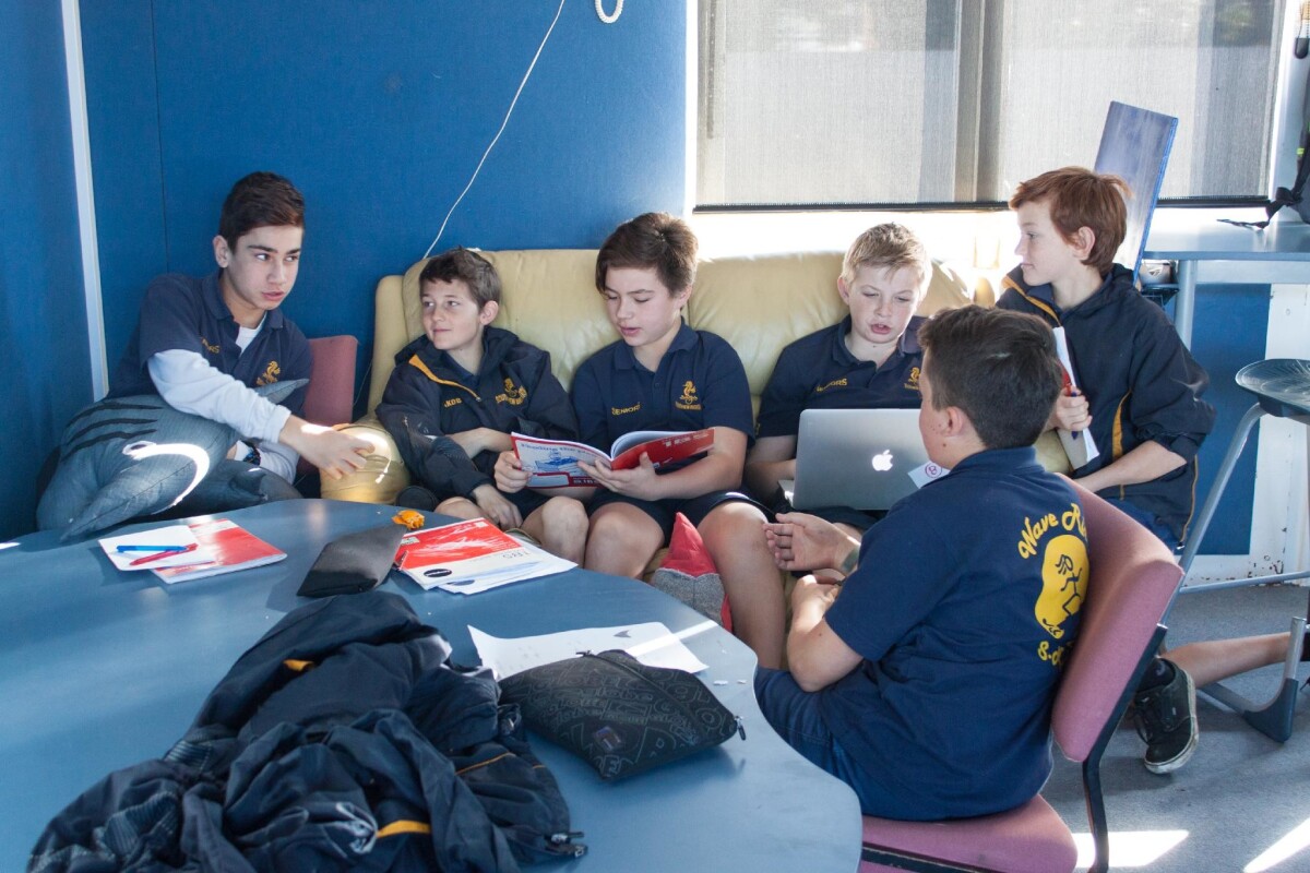 A group of Wave Rider students at South New Brighton School discussing a text exercise in class. Wave Riders are the senior students at the school who have taken on leadership roles.