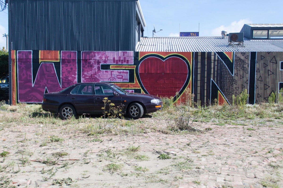 Street art on the side of a building on New Brighton Mall. In the foreground is a parked car.