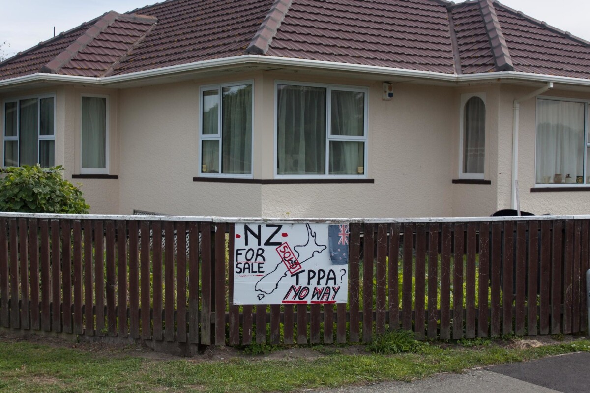 A hand made anti TPPA sign outside a house at 291 Marine Parade. The Trans-Pacific Partnership Agreement is an international trade deal that the government was discussing around during the time of the photograph being taken.