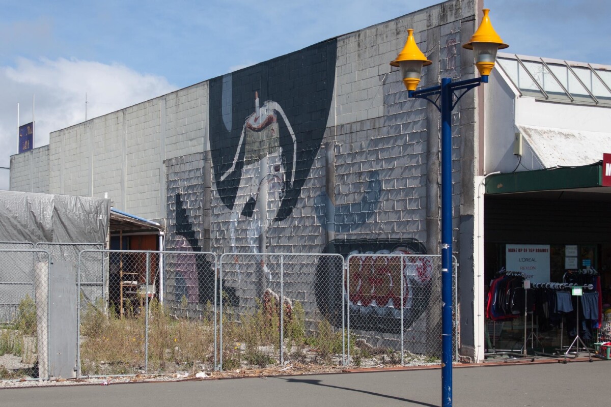 Street art along the side of a building at New Brighton Mall with fencing in the foreground.