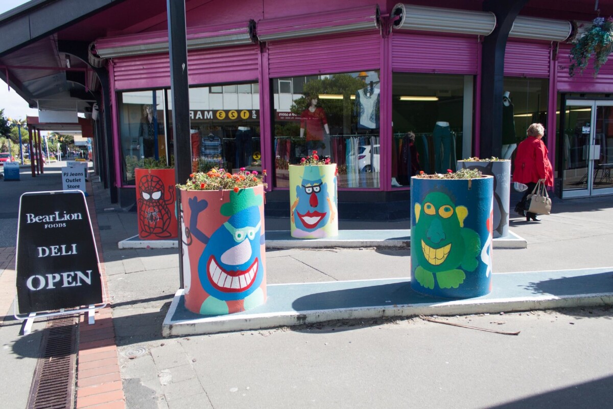 Street art painted on concrete flower pots in Carnaby Lane, Carnaby Mall near New Brighton Mall.