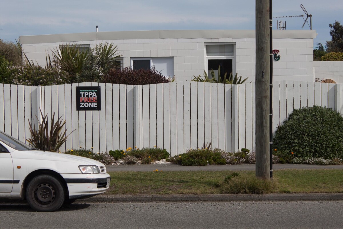 An anti TPPA sign outside a house at 433 Marine Parade. The Trans-Pacific Partnership Agreement is an international trade deal that the government was discussing around during the time of the photograph being taken.