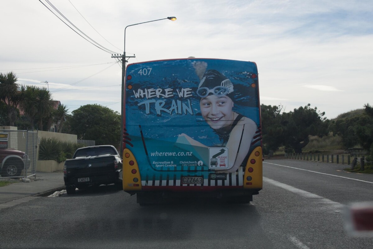 A metro bus pulling out from the New Brighton Club bus stop on Marine Parade, New Brighton. A Christchurch City Council recreation and sports centres advertisement is on the back of the bus.