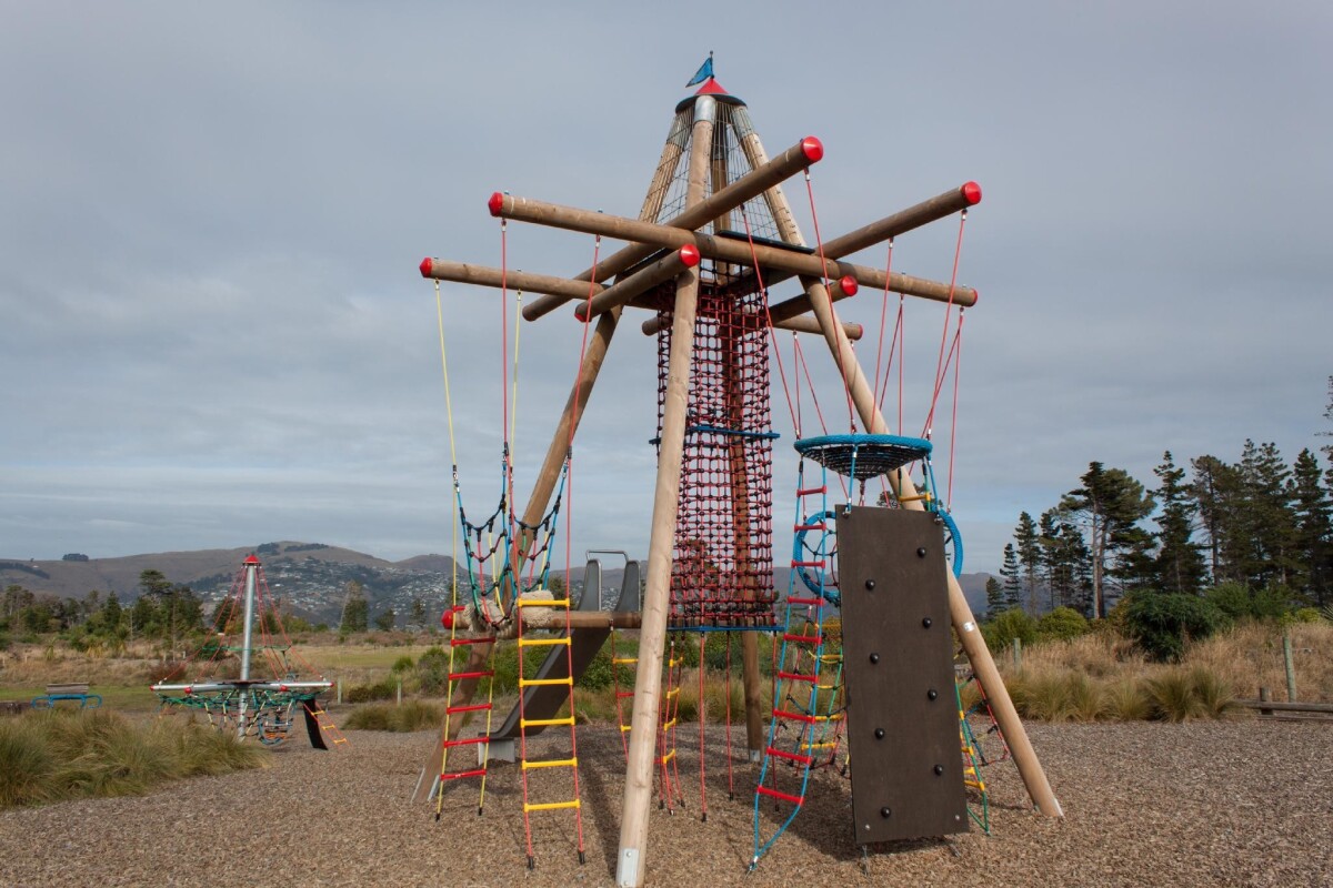 View of climbing frames in the playground in South New Brighton Park. Views across to the Port Hills are in the background.