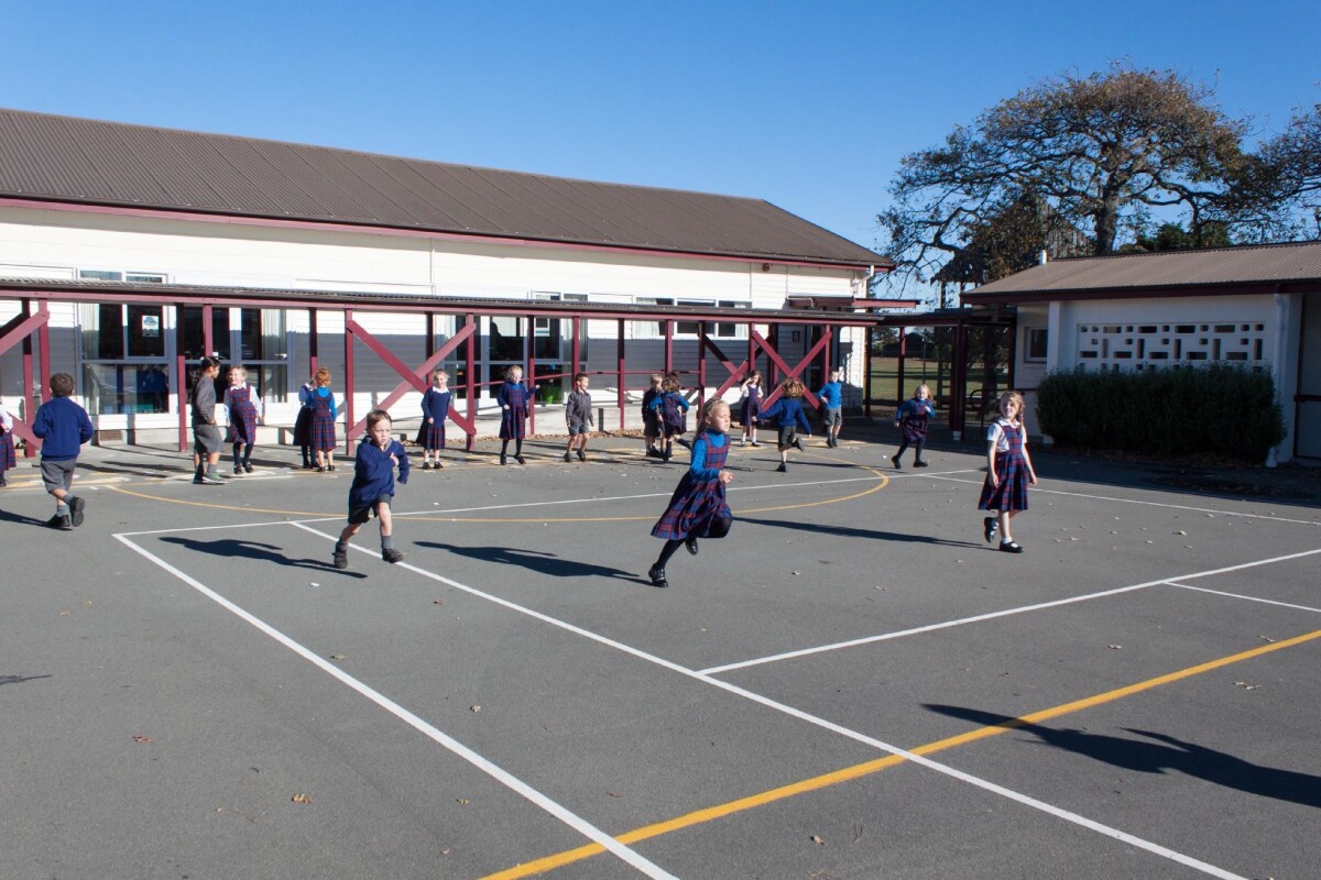 A group of children on the playground at New Brighton Catholic School during a physical education class.