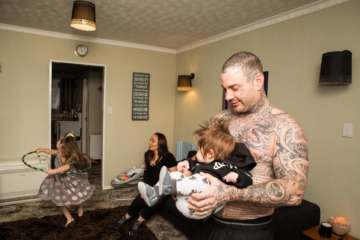 A family in a living rom in their home in New Brighton. Parents Clint and Sabina are with their children Mia and Jett.