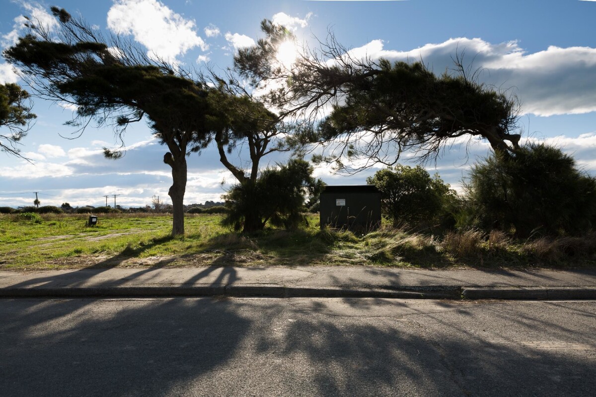 View of trees and an electricity box in the Residential Red Zone in New Brighton.