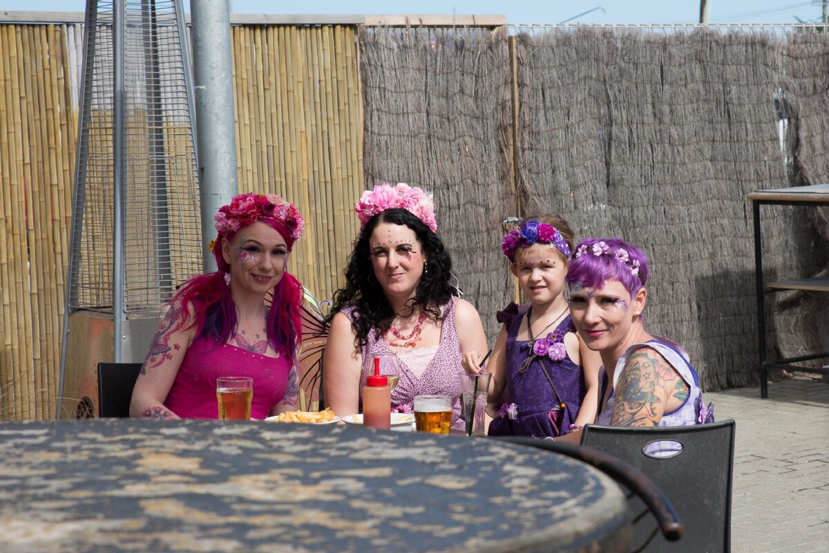 Three women and a child dressed as fairies and sat in the outside seating of The Wave Bar on New Brighton Mall, New Brighton..