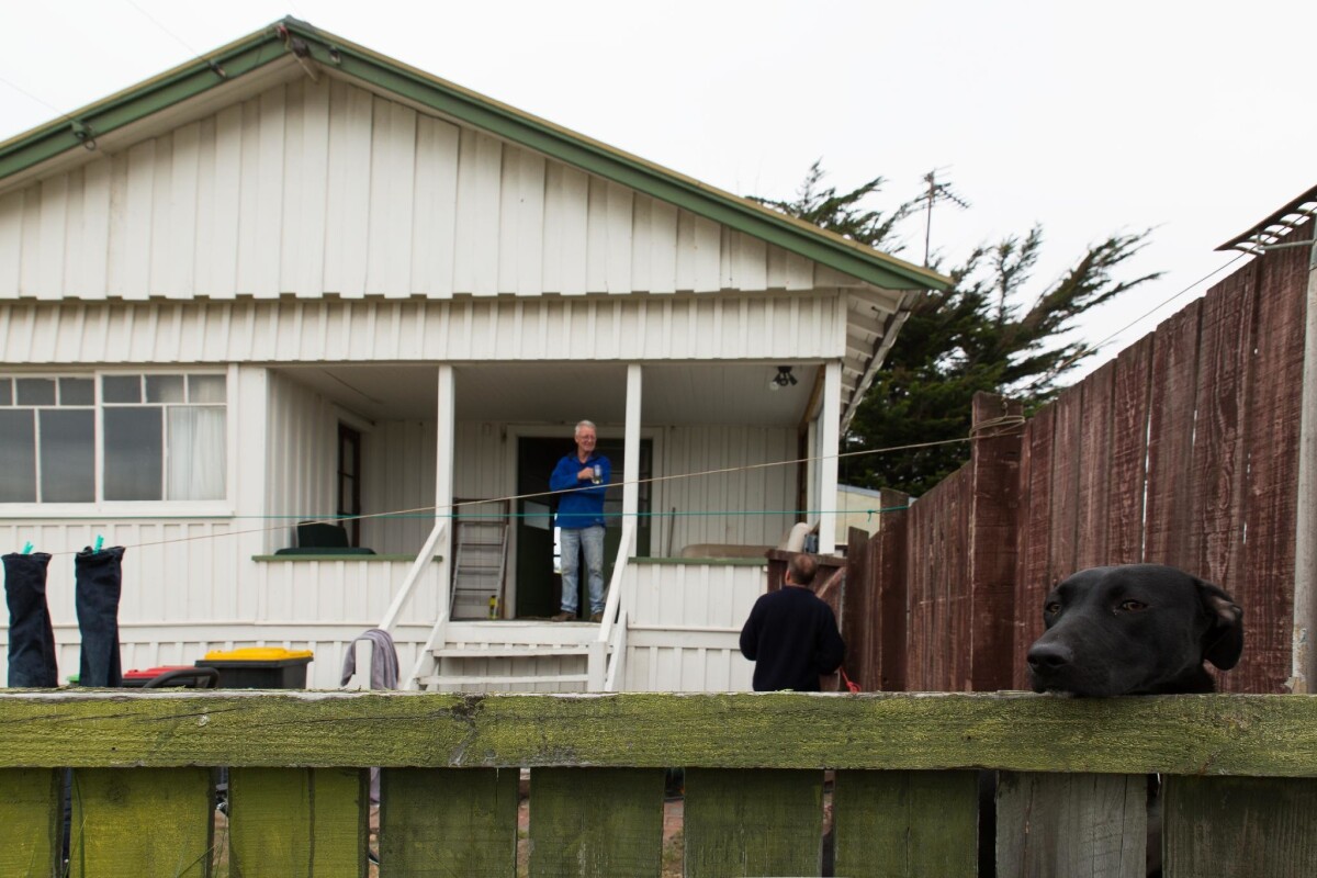Exterior of a house on Effingham Street, North New Brighton with owner, Lindsay talking to his friend while his dog protects the house in the foreground.