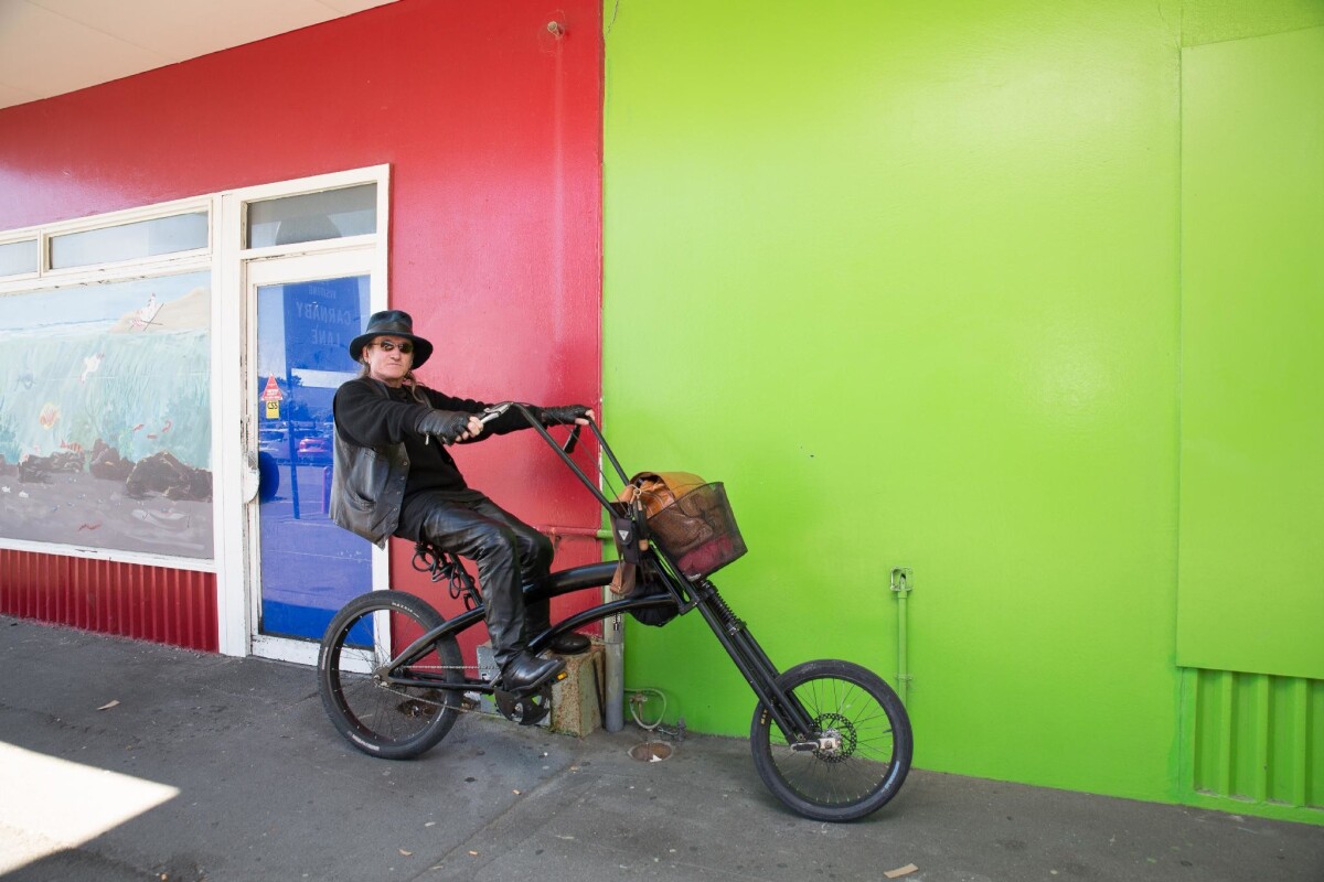 Peter Donnelly, best known as the "Sand Man", on a bicycle at Carnaby Mall in New Brighton. He has created over 1000 artworks in the sands of New Brighton beach.
