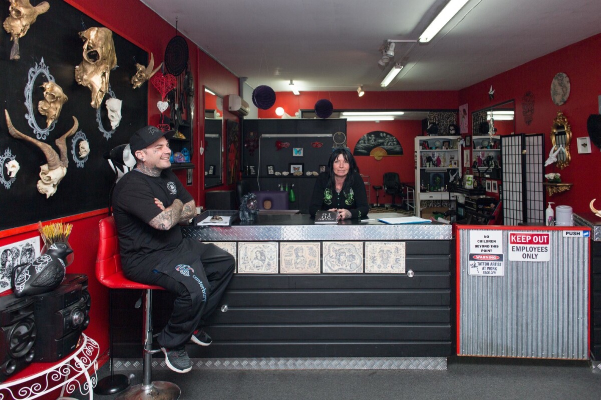 Interior of the Inked on Beauty Tattoo shop at 108B Seaview Road, New Brighton. A staff member is stood behind the till with a customer sat in the waiting area.