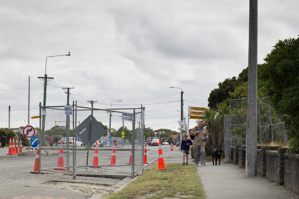 A man with a child and a pet dog walking along Hawke Street in New Brighton. To the left are traffic cones and roadworks.