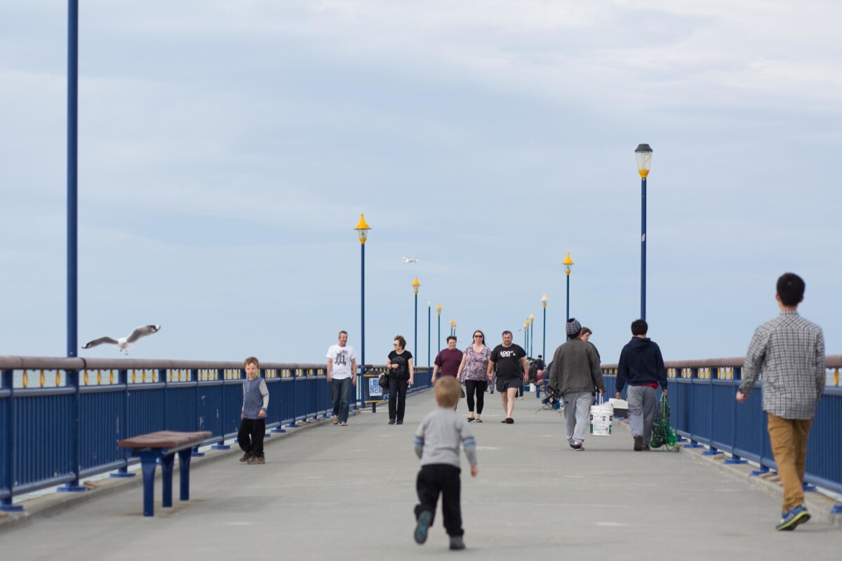 View down New Brighton Pier of families and fishermen. To the left is a seagull coming in to land.
