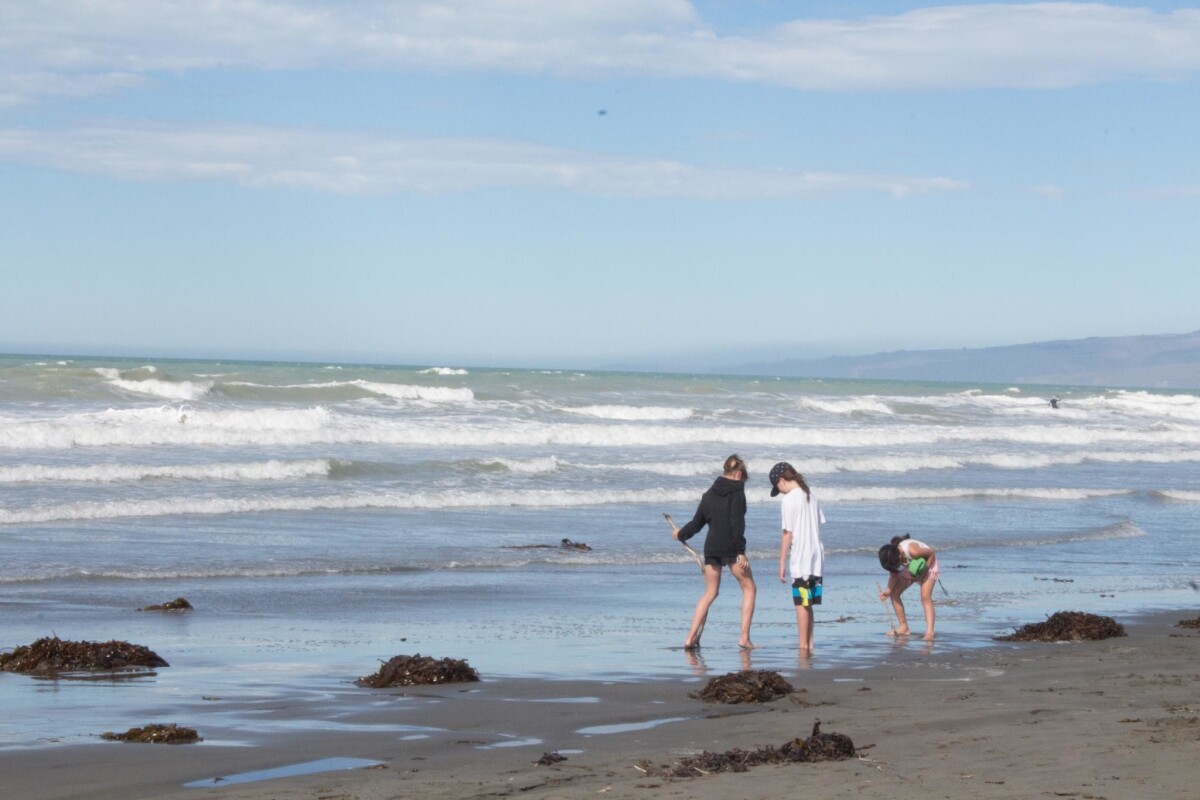 Three children playing on South New Brighton beach with the waves and views across to Godley Head in the background.