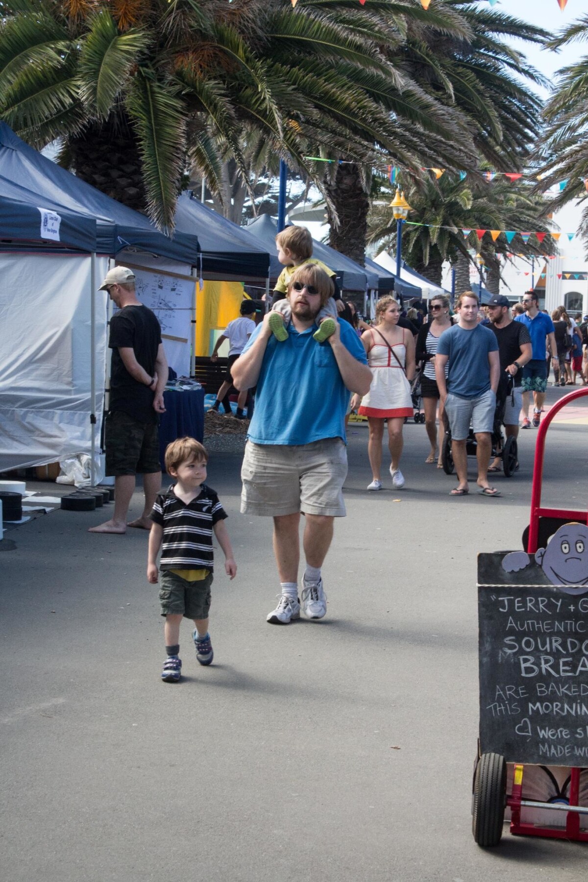 A man with two children walking along New Brighton Mall during a Saturday Seaside Market with stalls and bunting in the background.