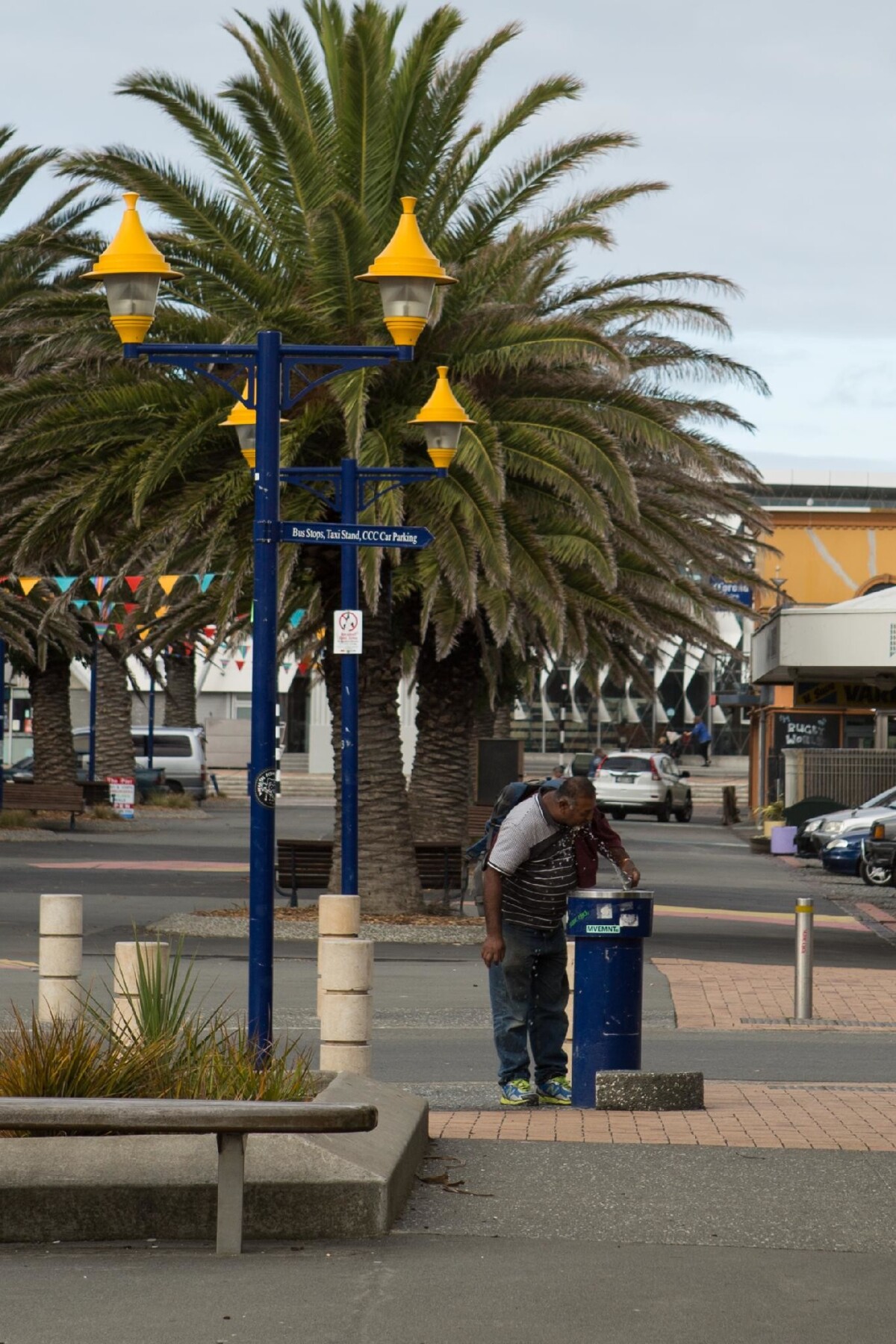 View down New Brighton Mall towards the beach with a man using a water fountain in the foreground. The exterior of New Brighton Library is partially visible in the background.