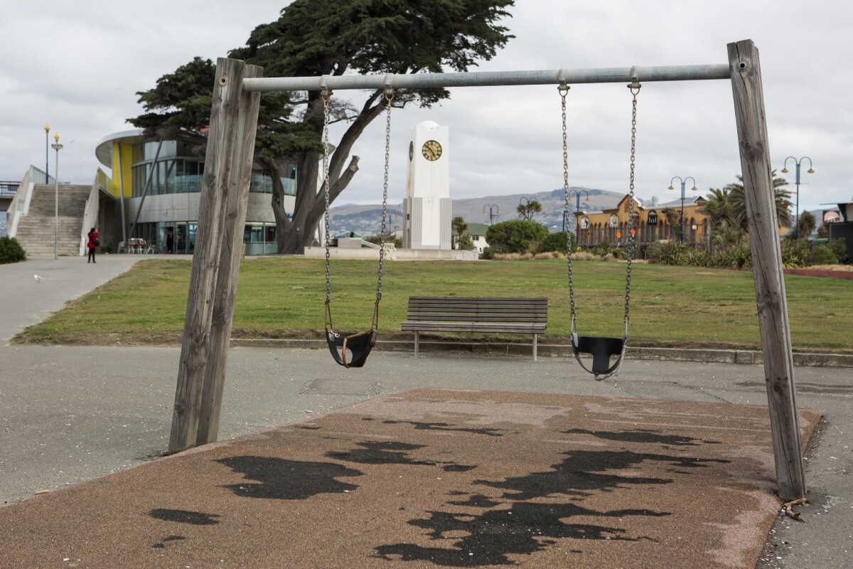 View looking south at New Brighton from swings at the whale pool playground, with the Library to the left and the clock tower in the centre along Marine Parade. The Port Hills are visible in the background.