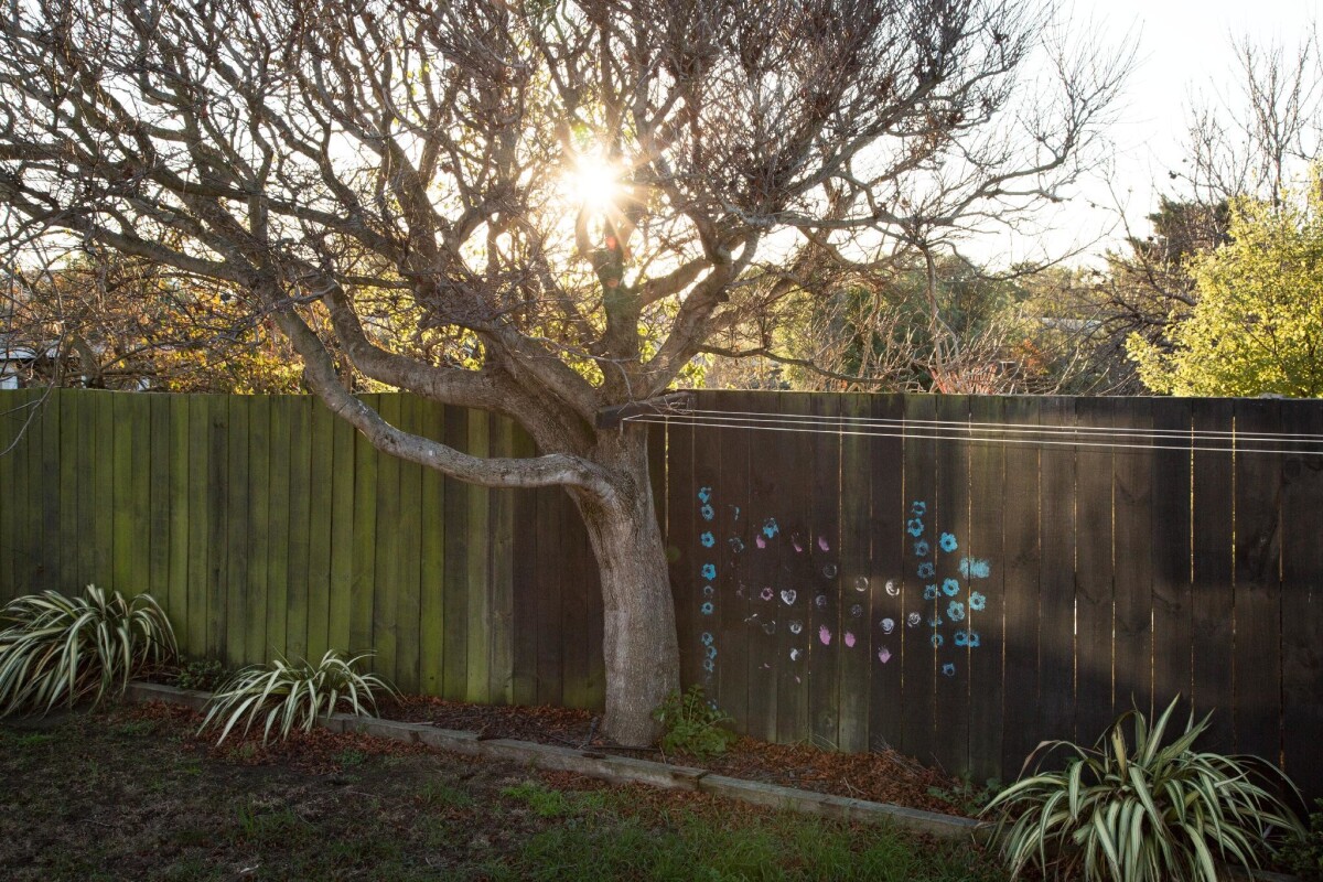 View of paintings on a fence and of trees in a garden at a house on Beatty Street in South New Brighton.