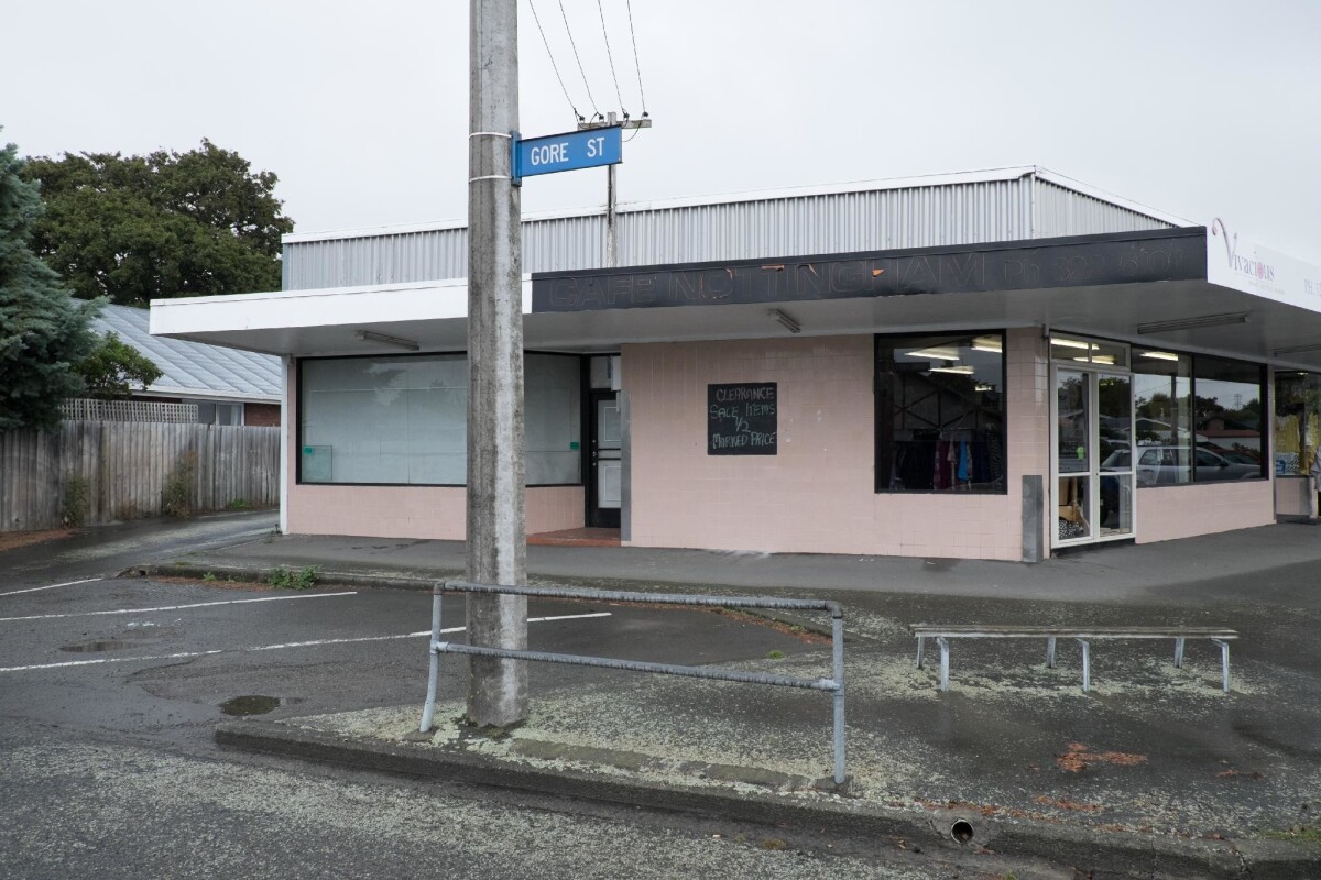Looking towards the shops on Nottingham Avenue from Gore Street, Halswell. The shop in the centre was formerly Café Nottingham now Vivacious, a woman's clothing shop.