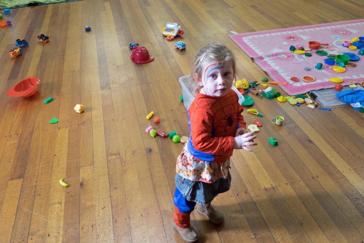 Girl in Spider Man costume with her face painted with toys at Little Steps. Face painting is one of the activities on offer at Little Steps, a playgroup for 'Bumps, babies, toddlers and pre-schoolers' at Halswell Community Hall, 450 Halswell Road.