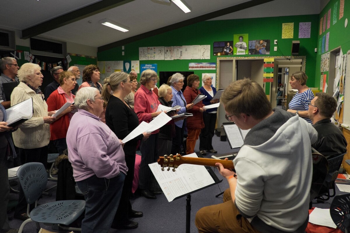Members of the Halswell Community Choir practicing in a classroom at Aidanfield Christian School, 2 Nash Road.