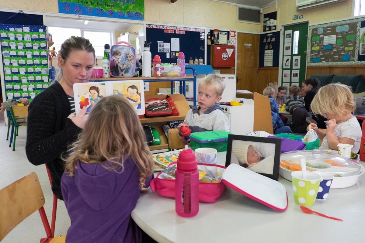 Mel, a student teacher, reading to Austin, Abby and another child at Kidsfirst Kindergarten at 134 Wales street, Halswell. A framed photograph of the recently born Princess Charlotte Elizabeth Diana sits on the table.