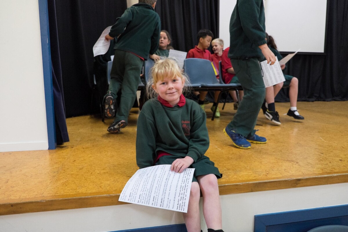 Jessica, student in year 3 at Oaklands Primary School, preparing to present at the school assembly in the school hall at 37 Cunningham Place, Halswell.