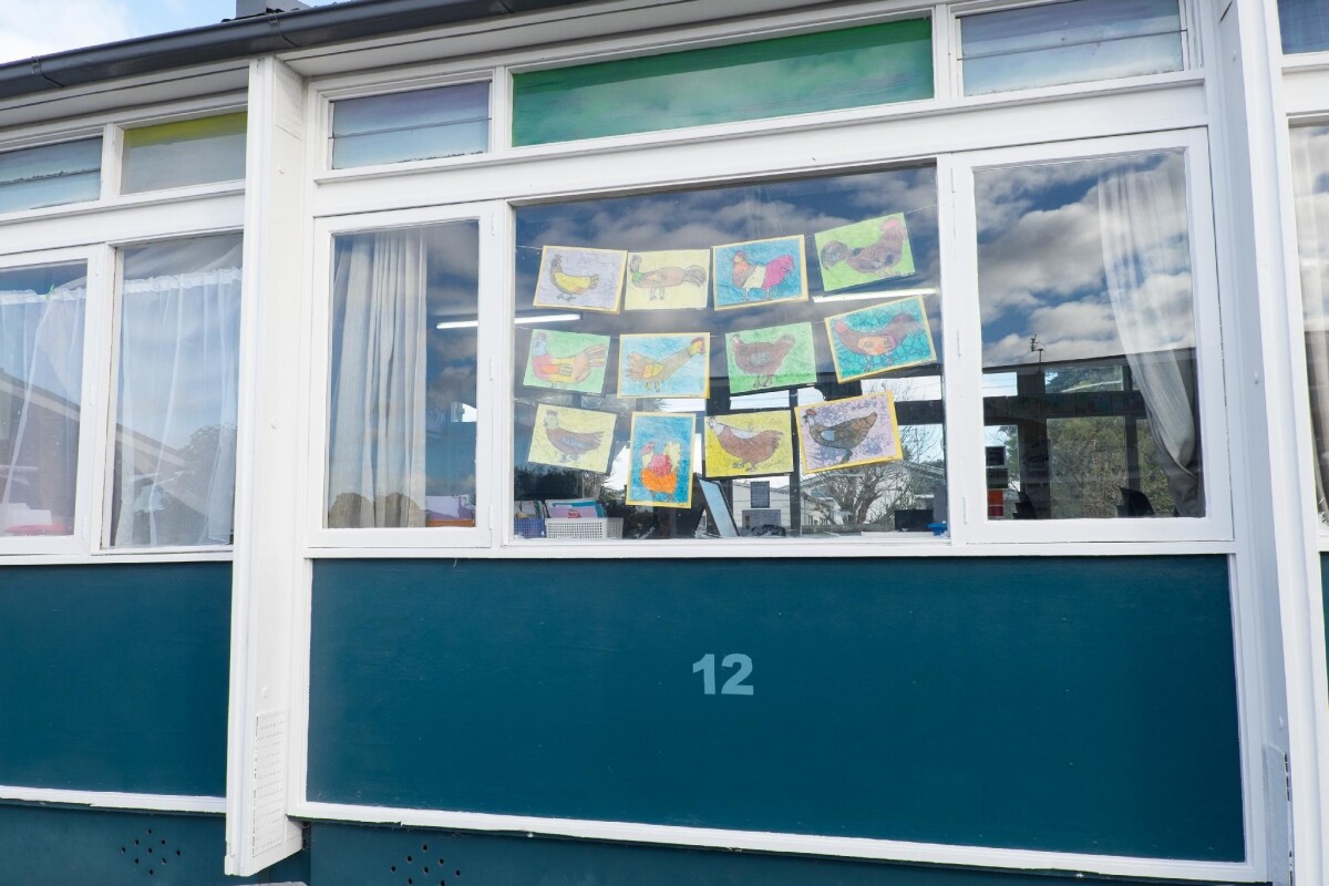 Exterior of classroom 12 with art hanging in the window at Oaklands Primary School at 37 Cunningham Place, Halswell